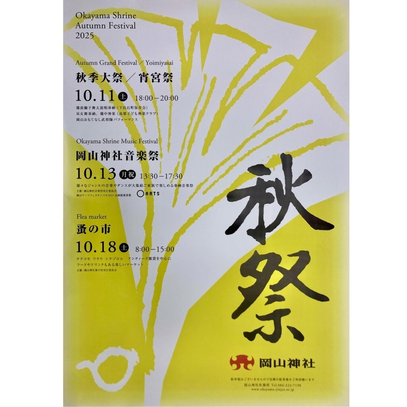 岡山神社のお知らせ 2025年09月25日 岡山神社秋季大祭開催のお知らせ(秋季大祭 宵宮祭10月11日(土)・音楽祭13日(月・祝)・蚤の市18日(土)) 岡山神社秋季大祭開催のお知らせです・・・ 2025年09月23日 岡山神社 蚤の市 秋祭開催のお知らせ(令和7年10月18日(土)8時~15時) 岡山神社蚤の市 秋祭が開催され・・・ 2025年08月25日 旅行予約サービス「 NEWT(ニュート) 」で紹介されました 海外旅行・国内旅行のツアーやホ・・・ ギャラリーを見る